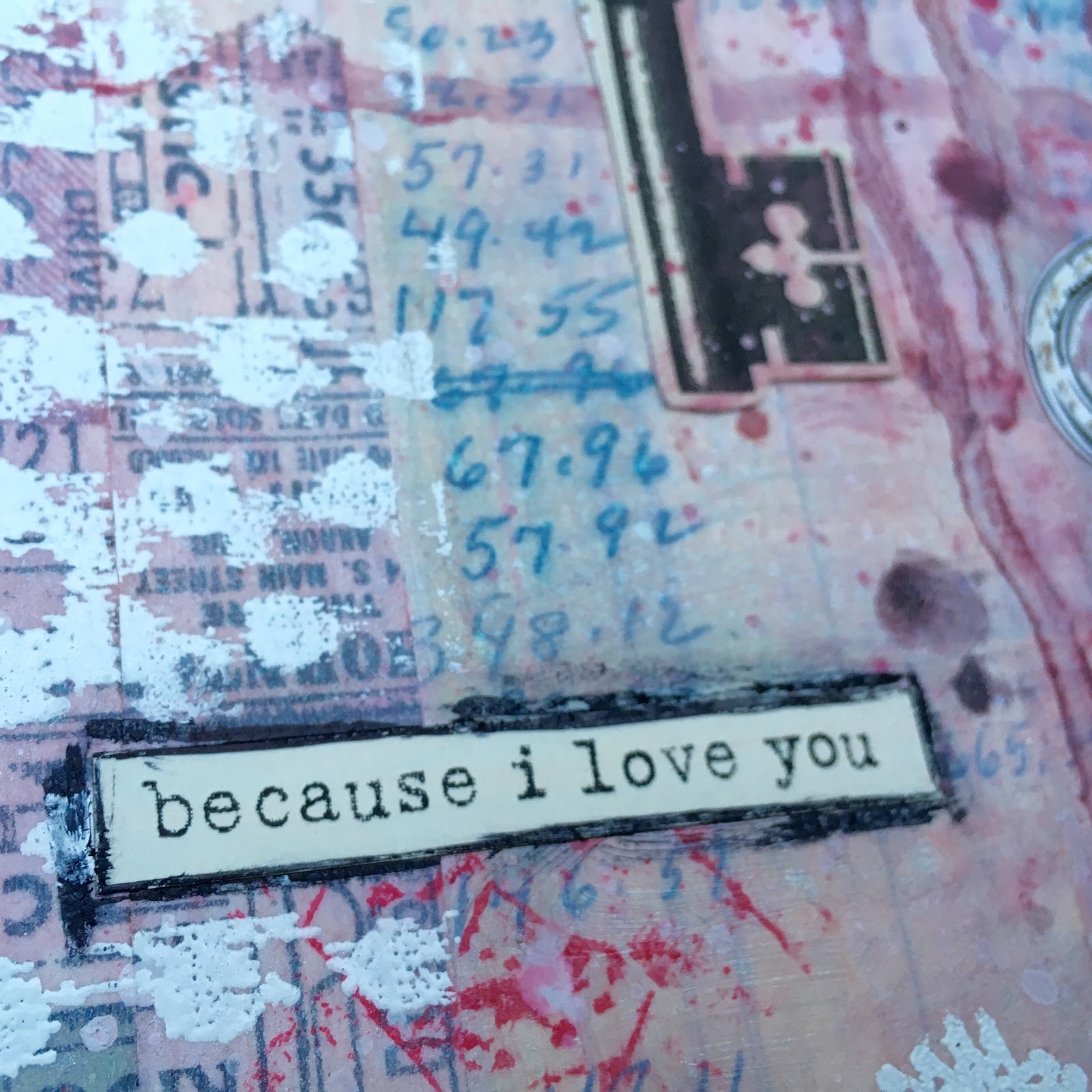 I added this grungy love sentiment and outlined it with black marker, which I smeared with my finger.