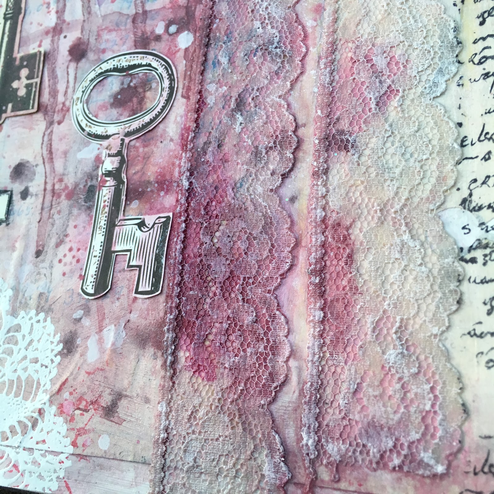 I really love the pools in the lace.  I go back and dry brush gesso over the lace to further accent the pattern.