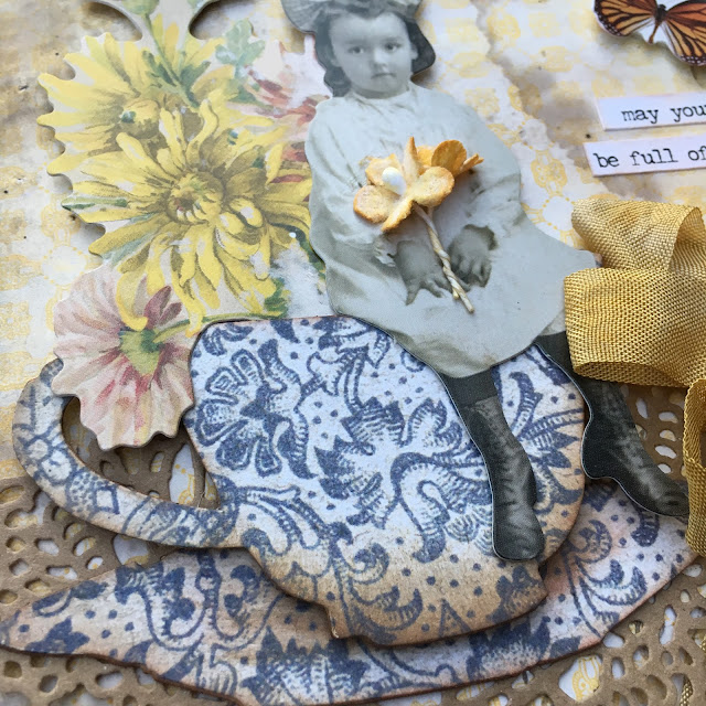 I was so thrilled to find Tim's tea cup dies locally and snagged them up a few months ago.  My first project with the cup can be found HERE.  I cut the cup from Tim's new paper stash, Memoranda.  This was a gift from my crafty bud Mimi of She's Crafty.  Thank you my friend!  I am loving my goodies.  You are the best!!!  <3  I tucked some of the new floral ephemera from the Botanical Layers collection in the cup and perched the sweet girl down.  She's holding the new stainable flowers called Bouquet Findings.  These are so neat!