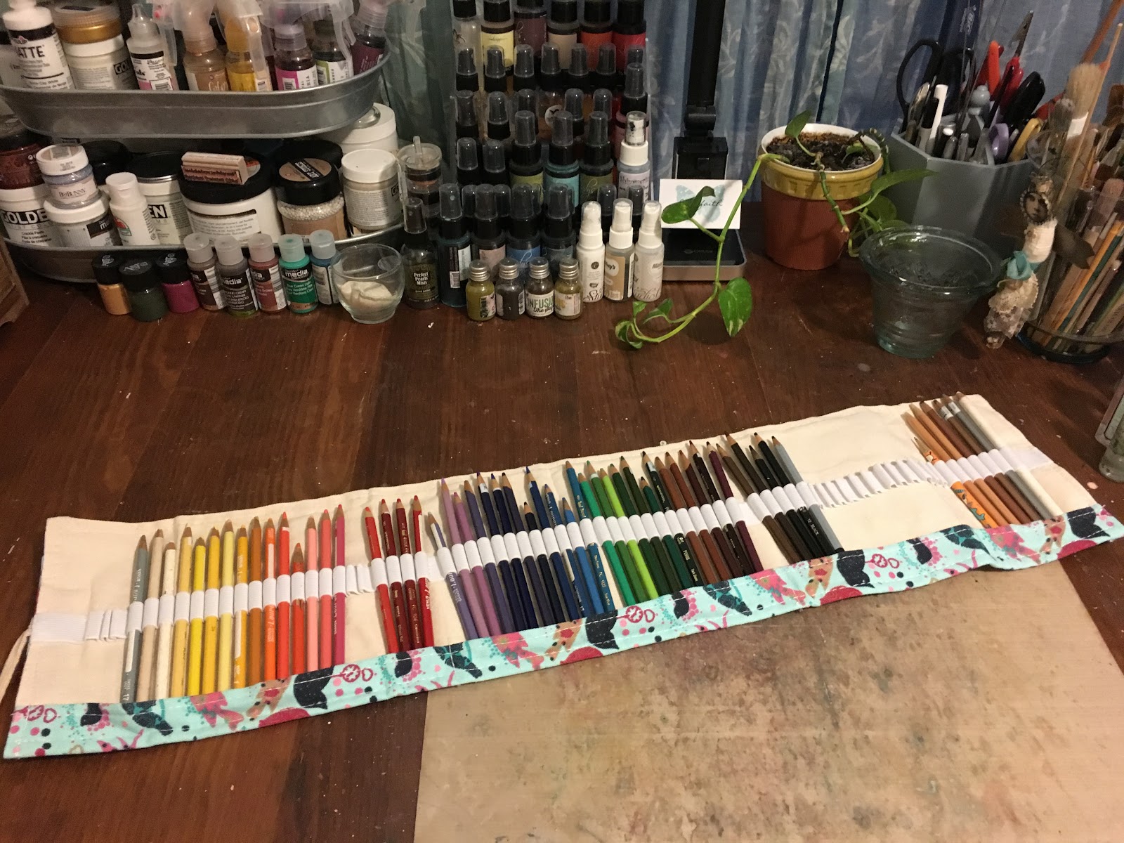 Oh, I love the pencil wrap, I'm going to make one for my crochet hooks - just the thing to keep them in order. Your colouring looks wonderful to me; it's not something I'm good at, but I'm keen to learn. Love the idea, that you can craft anywhere and anytime, if you set your mind to it!
