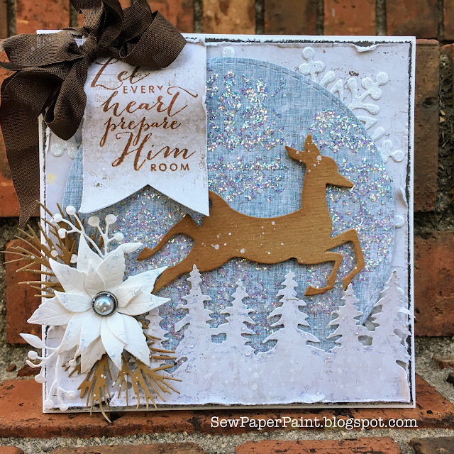 I used Prima texture paste with a Tim Holtz Holiday Knit stencil for my circle panel  I poured IndigoBlu Unicorn Sparkle onto the wet paste for a high dose of shimmer.  Beneath the circle I tucked in glittery snowflake dies to create a frame.  I cut my Tim Holtz deer die from thin chipboard and sponged the edges with VP DOX to give it some variation.