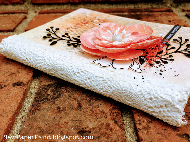 Here's a shot of that amazing lace spine. I used paste to stencil the same geometric stencil on my cover, then gave it a good spray. I stamped a PA flower and tucked it beneath my 3D Prima flower with some bundled string and a sentiment sticker. I embossed two black die cuts and tucked them in too, with a final splash of white and black gesso on everything.